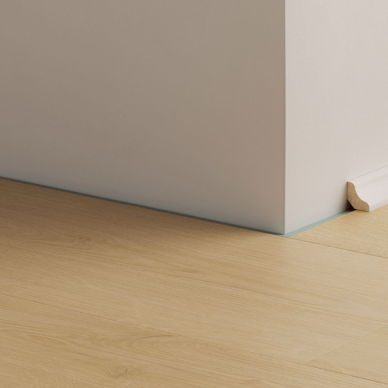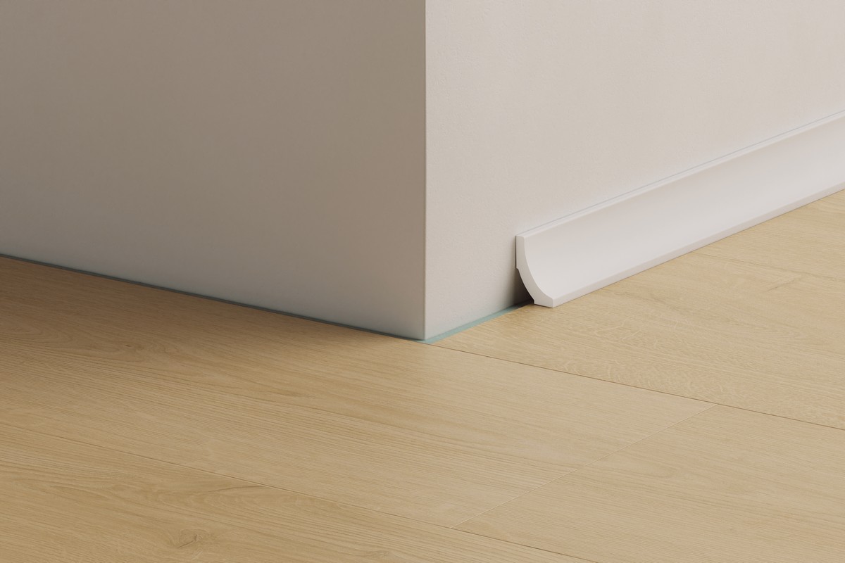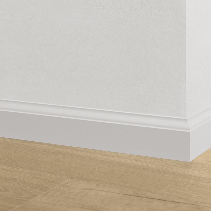 Listwa Scotia do malowania, którą można również pozostawić w białym kolorze. Łatwy montaż za pomocą kleju One4All. Nie nadaje się do wilgotnych pomieszczeń — sprawdź naszą ofertę wodoodpornych listew przypodłogowych.