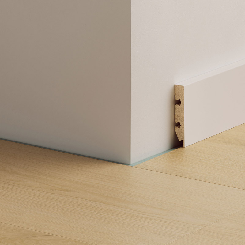 Malowane małe listwy przypodłogowe z dołączonym systemem Uniclic zapewniającym jednolite wykończenie i prosty montaż, nawet w mniejszych przestrzeniach. Długość 240cm