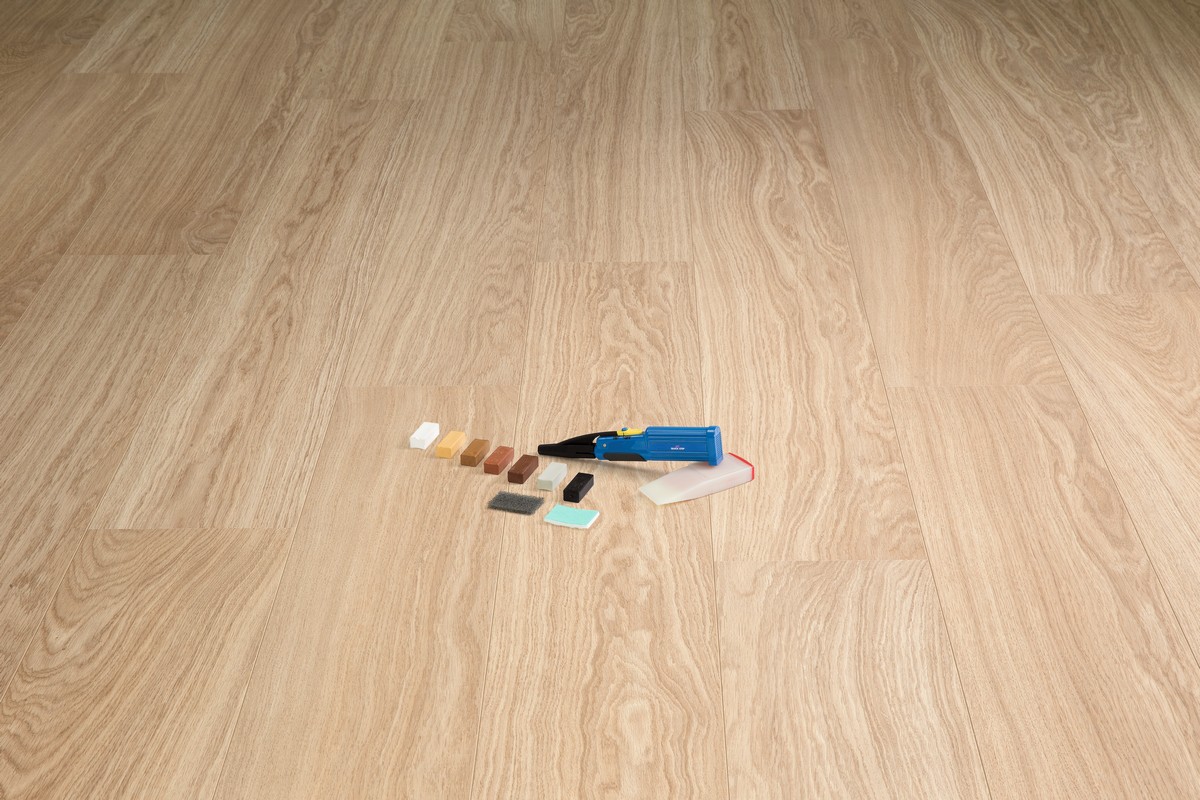 Zestaw naprawczy Quick-Step pomoże z łatwością usunąć drobne uszkodzenia bez utraty oryginalnego koloru podłogi. Wystarczy odtworzyć kolor uszkodzonych – na przykład przez spadające nożyczki – desek, stosując jeden z siedmiu kawałków wosku dobranych do wszystkich kolorów podłóg Quick-Step. W zestawie: nóż do cięcia na gorąco, grzebień do czyszczenia, siedem bloków wosku, nakładka do piaskowania.