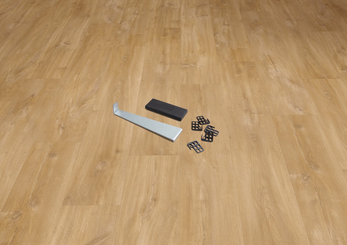 Zestaw montażowy Quick-Step zawiera wszystkie narzędzia potrzebne do szybkiego i bezpiecznego montażu podłogi: klocek montażowy, kołki dystansowe gwarantujące odpowiednie szczeliny dylatacyjne oraz metalowy łom.