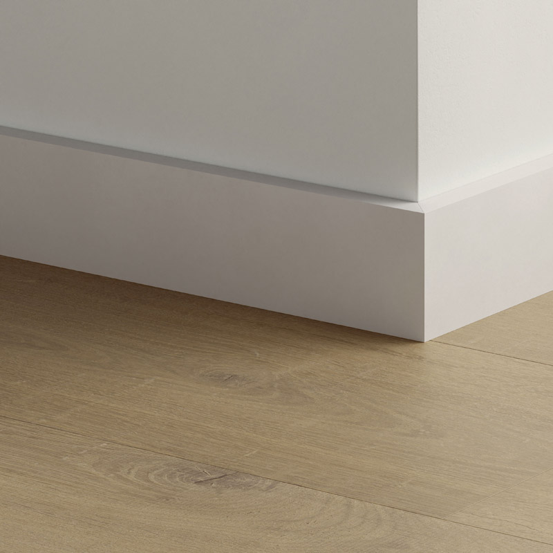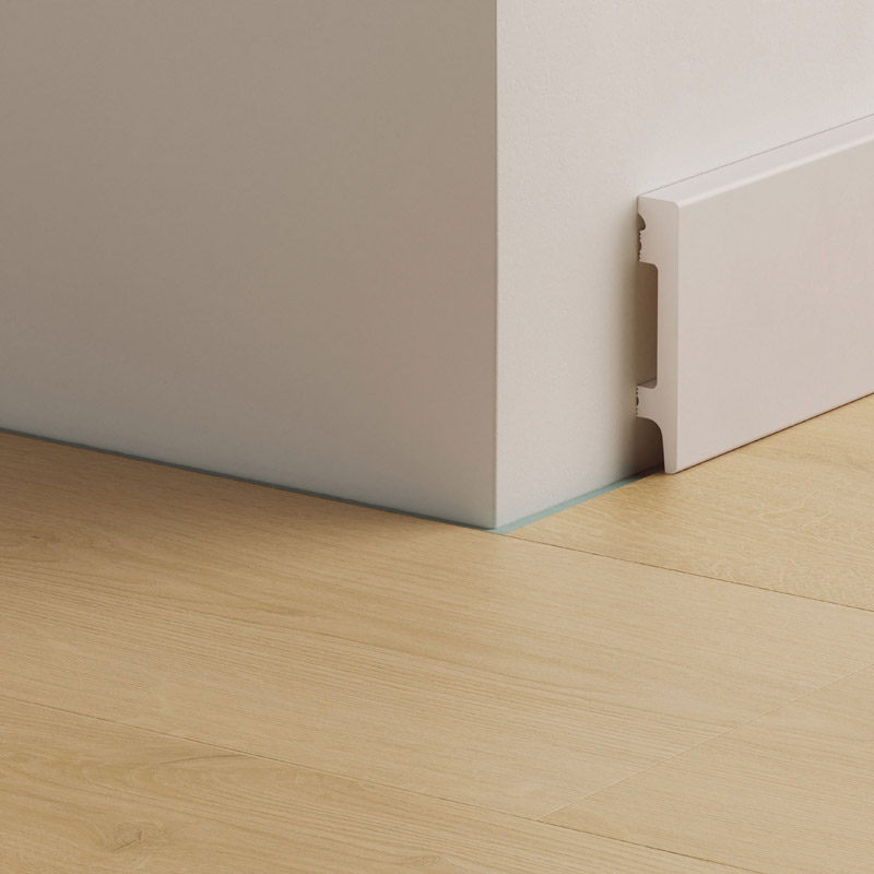 Listwa Scotia do malowania, którą można również pozostawić w białym kolorze. Łatwy montaż za pomocą kleju One4All. Nie nadaje się do wilgotnych pomieszczeń — sprawdź naszą ofertę wodoodpornych listew przypodłogowych.