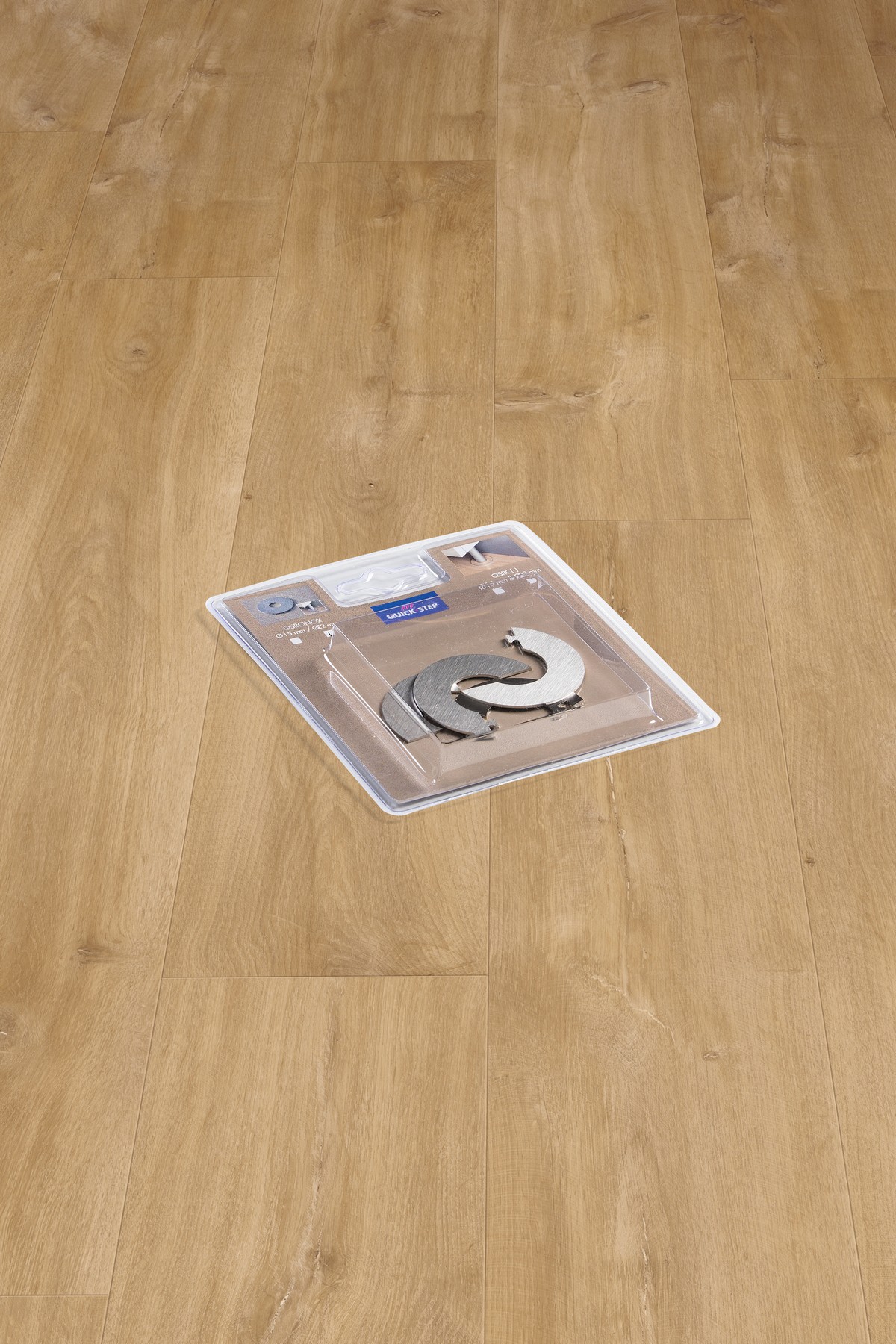 Zestaw montażowy Quick-Step zawiera wszystkie narzędzia potrzebne do szybkiego i bezpiecznego montażu podłogi: klocek montażowy, kołki dystansowe gwarantujące odpowiednie szczeliny dylatacyjne oraz metalowy łom.