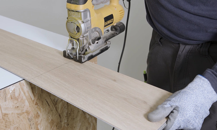 KROK 7: Docinanie podłogi Vinyl FlexAby ukończyć montaż podłogi, w pewnym momencie konieczne będzie przycięcie pięknych paneli Vinyl Flex. Załóż rękawiczki i użyj ołówka, aby narysować linie cięcia. Zawsze przycinaj panele za pomocą wklęsłego noża i narzędzia do montażu paneli winylowych oraz upewnij się, że powierzchnia dekoracyjna jest skierowana do góry. |